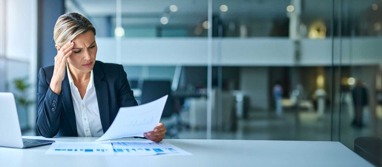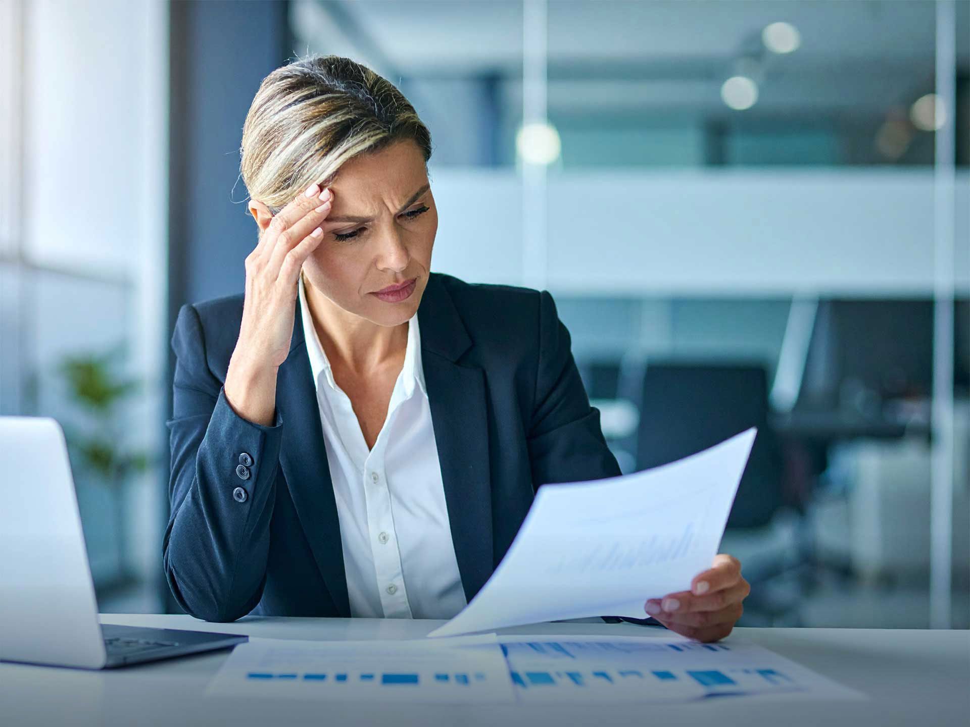 A woman in professional business attire sits at her desk, her gaze fixed with apprehension on the financial documents before her.